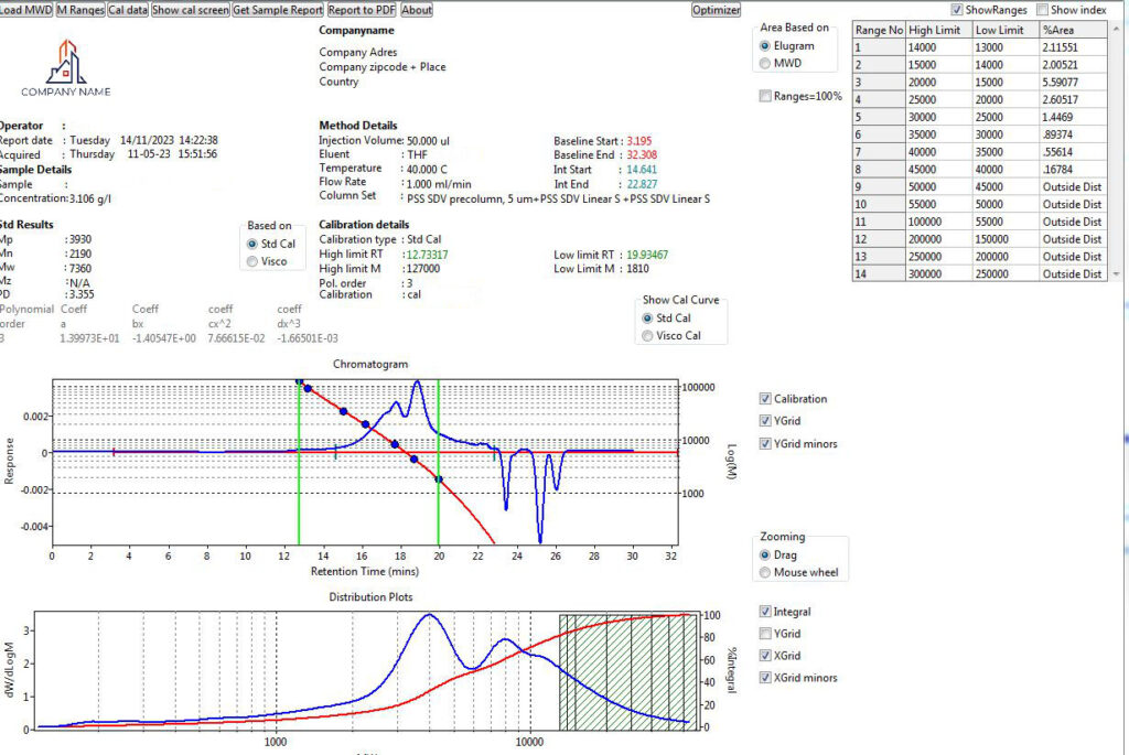 It can work on several chromatograms simultaneously, has an extensive calibration evaluation (showing a confidence interval, first derivative of the curve and statistics overview), can evaluate as many Area % as you want, independent baseline and integration limits, all MWD’s for all possible calibration fits in one screen so you can judge much better how well the choice of calibrates is, etc, etc. For some more pictures see Home page.